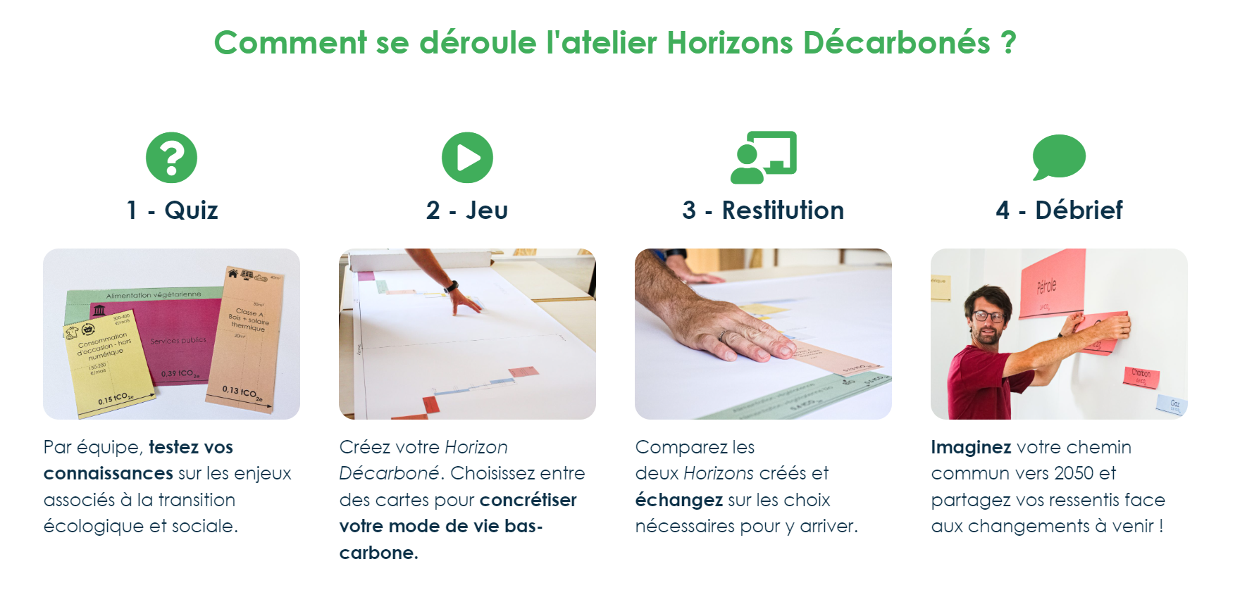 Plusieurs ateliers de 3h (en présentiel) et 3h30 (en distanciel) sont proposés par Horizons Décarbonés.