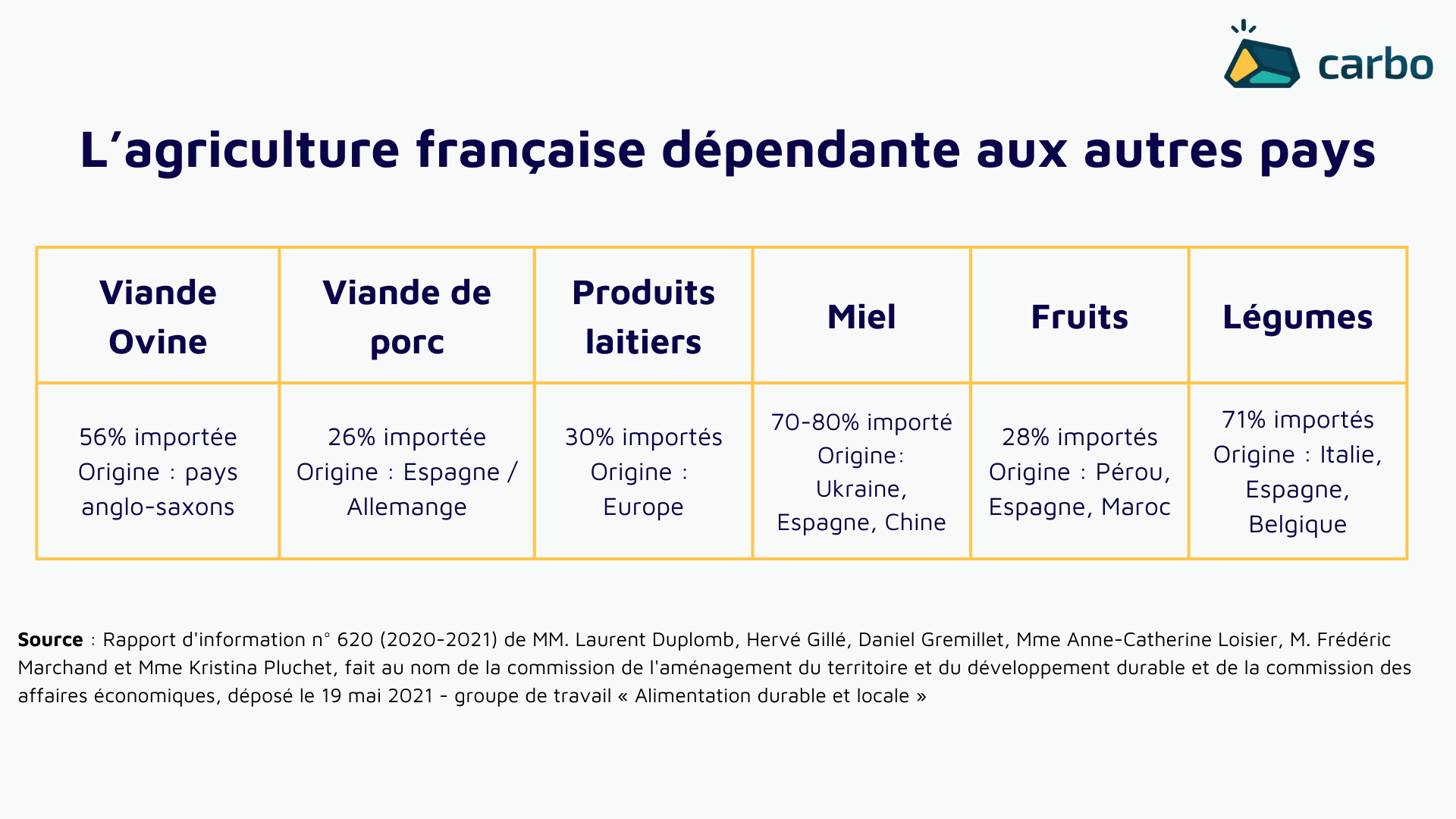 - Le contexte géopolitique instable des pays avec qui la France commerce (pays autour de la mer noire ou du Brésil) pour nourrir ses animaux ainsi que les hausses des coûts de l'énergie associée fragilise la chaîne d'approvisionnement et installe une dépendance risquée.